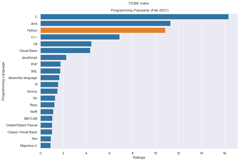 .set_title('TIOBE Index \n\n Programming Popularity (Feb 2021)')