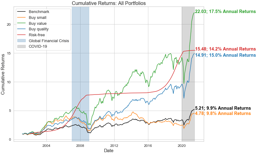 The portfolios based on buying value and quality stocks follow a similar logic, except value stocks involve buying top 30% companies by book-to-market ratios, and quality stocks involve buying top 30% companies by return on assets.