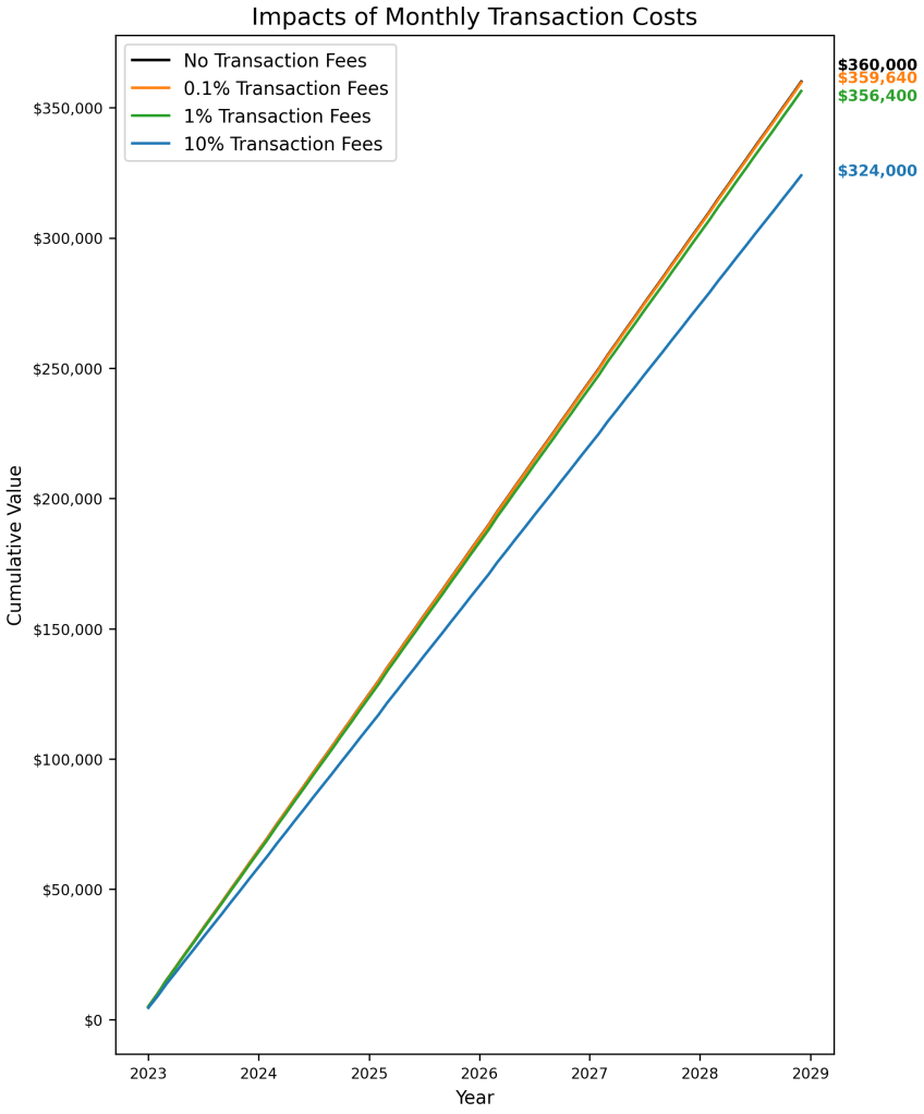 - Portfolio 1 (in black): The investor invests $5000 every month with no monthly transaction costs. Zero transactional cost will never hold true in reality, so this portfolio is just a hypothetical benchmark.