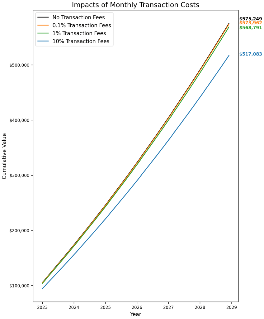 To visualise the impact of transaction costs, we’ll compare how a portfolio with no cost differs from those with costs. The graph below shows 4 portfolios: